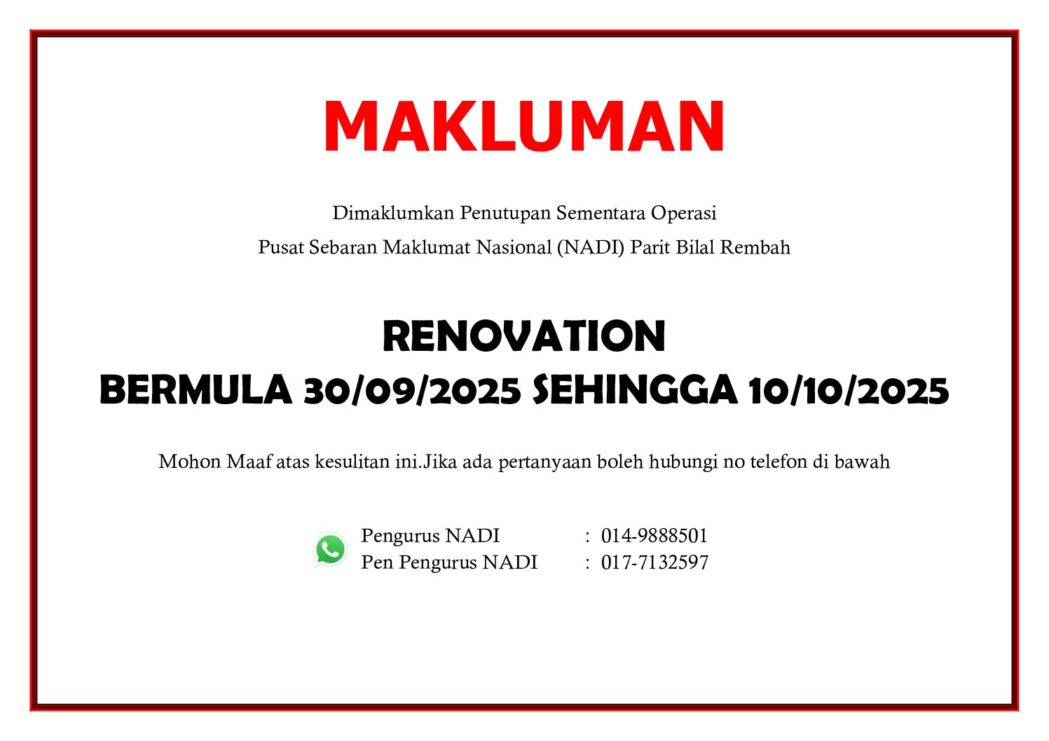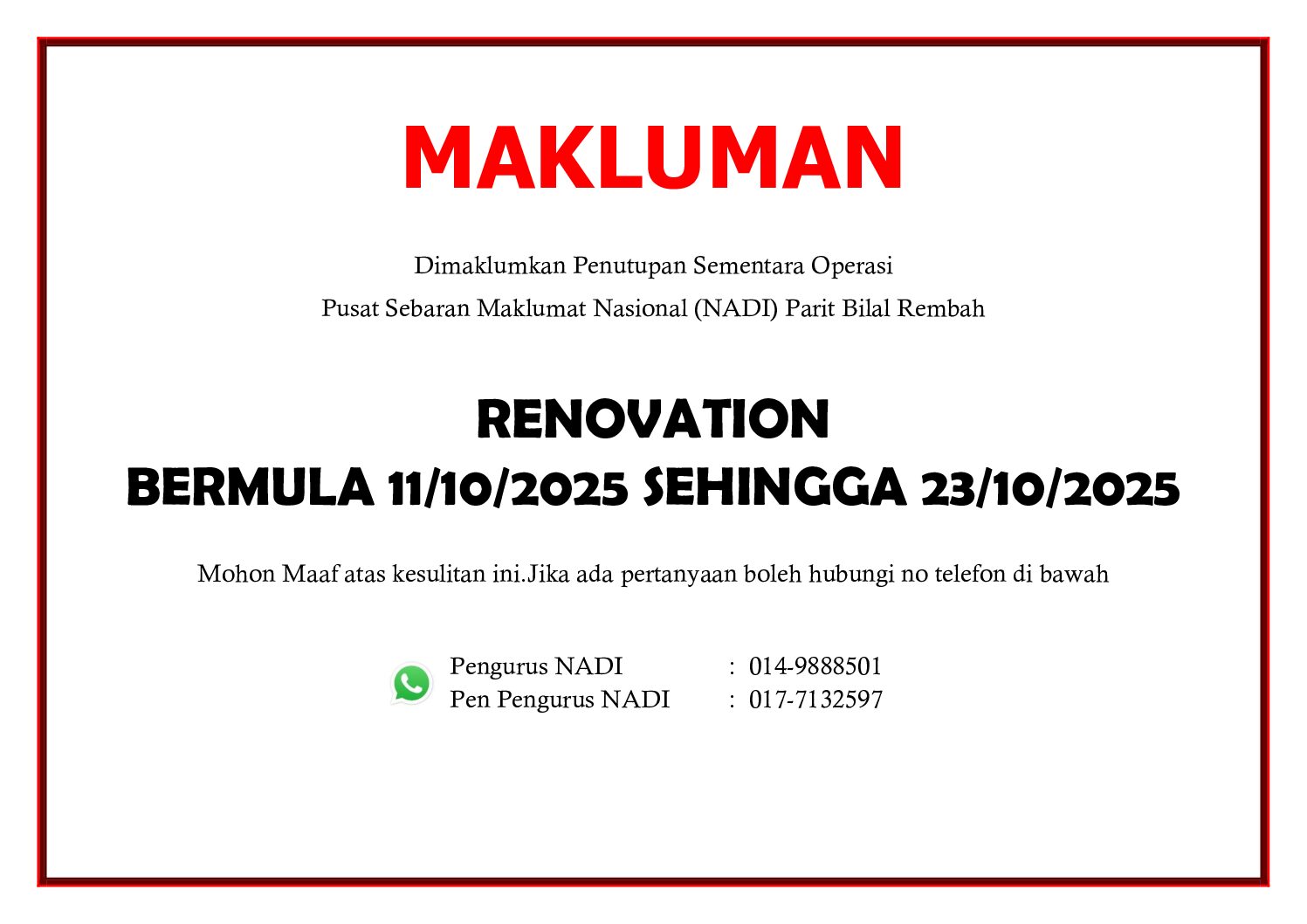 📢 NOTIS PENUTUPAN NADI 📢Dimaklumkan bahawa NADI Parit Bilal Rembah akan ditutup sementara bermula 11 Oktober hingga 23 Oktober 2025 bagi tujuan kerja-kerja renovasi.Segala kesulitan amatlah dikesali. Terima kasih atas kerjasama dan pemahaman anda. 🙏