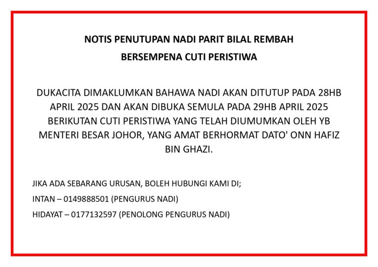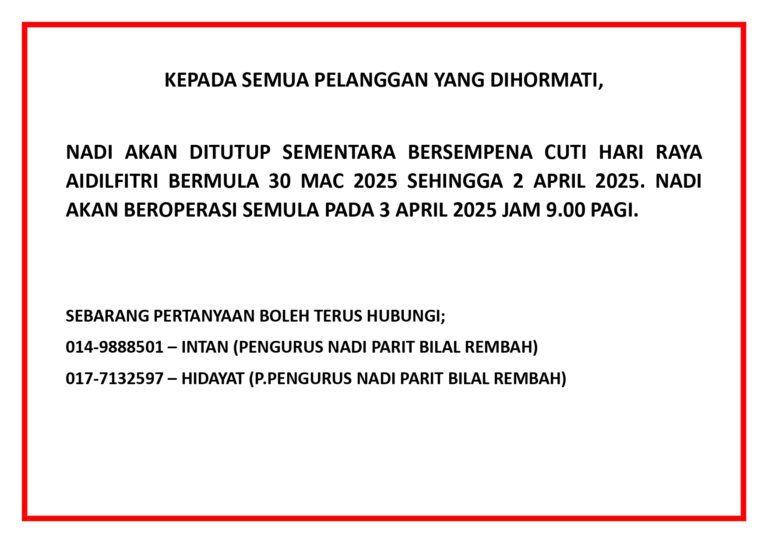 Notis Penutupan NADI Dengan segala hormatnya, dimaklumkan bahawa NADI akan ditutup pada 11 Februari 2025 (Selasa) bersempena dengan Cuti Thaipusam. NADI akan kembali beroperasi seperti biasa pada 12 Februari 2025 (Rabu). Kami memohon maaf atas sebarang kesulitan yang mungkin timbul […]