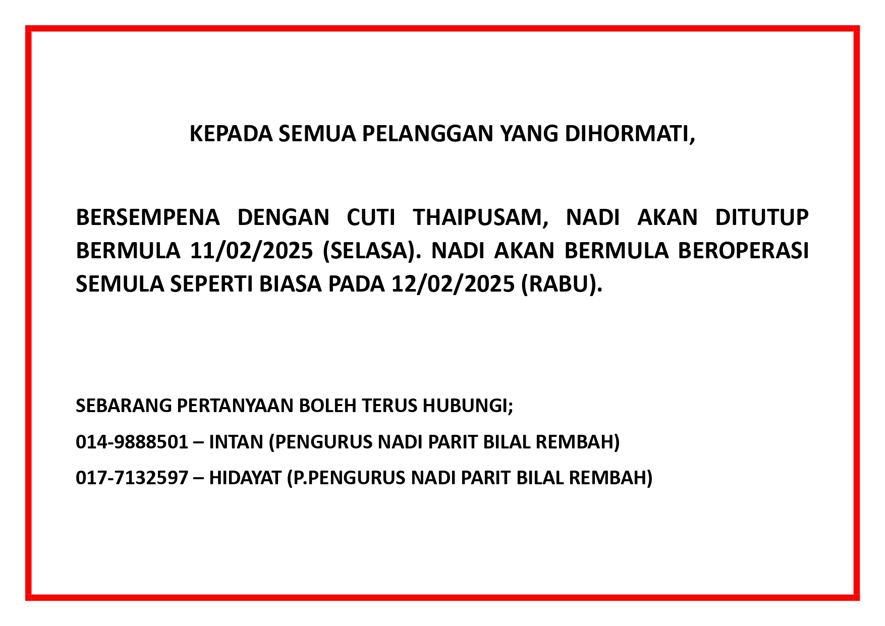 Notis Penutupan NADI Dengan segala hormatnya, dimaklumkan bahawa NADI akan ditutup pada 11 Februari 2025 (Selasa) bersempena dengan Cuti Thaipusam. NADI akan kembali beroperasi seperti biasa pada 12 Februari 2025 (Rabu). Kami memohon maaf atas sebarang kesulitan yang mungkin timbul […]